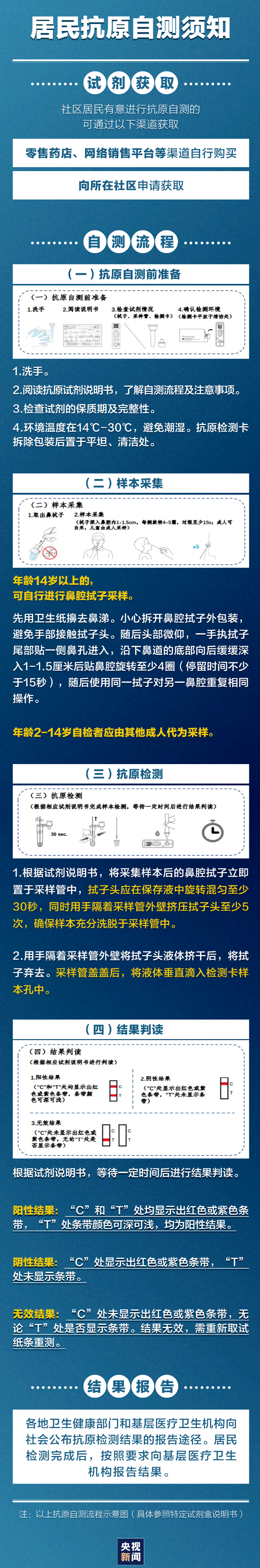 如何获取试剂?自测有什么流程?检测结果的报告途径是什么?居民抗原自测须知,一图速览→